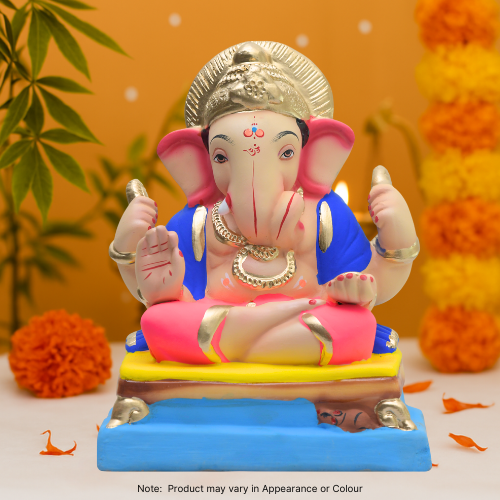 Okouzlující soška Boha Ganeši s jasně růžovým dhotim a živou modrou šálou. Zlatá koruna, šperky a detaily dodávají designu nádech bohatství. S oběma rukama vztyčenýma v požehnání, tato soška přináší mír, pozitivitu a radost do jakéhokoli prostoru. Kompaktní velikost ji činí vhodnou pro domácí oltáře, kanceláře nebo jako duchovní dárek.