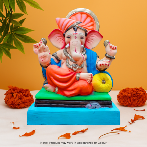 Oslavte tradici s touto výraznou soškou boha Ganeši v maharashtrijském stylu, ozdobenou výraznou purpurovou pagdi (turbanem) a jasně žlutým šátkem. Růžový dhoti dodává slavnostní atmosféru, zatímco složité zlaté ozdoby a detailní výrazy obličeje zachycují podstatu oddanosti a radosti. Sedící póza s oběma rukama zvednutýma k požehnání je ideální pro uctívání nebo slavnostní dekoraci. Barevný podstavec a miniaturka myši přidávají dotek kulturní autenticity.
