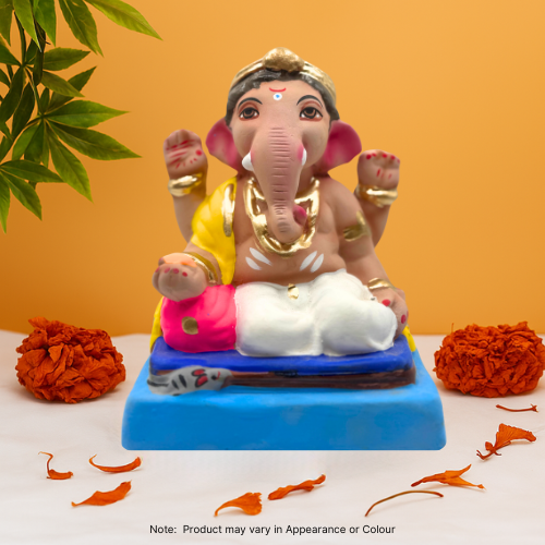 Tato socha Pána Ganeši kombinuje jasně růžové dhoti s veselým žlutým šálkem, což jí dodává slavnostní a povznášející vzhled. Ozdobena zlatou korunou a ornamenty, socha vyzařuje pozitivní energii. Tradiční sedící póza s žehnající rukou ji činí dokonalým doplňkem do vašeho domácího chrámu nebo slavnostní výzdoby.