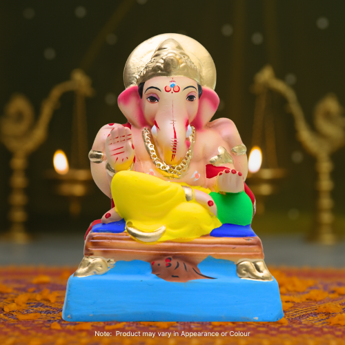 Malá, ale detailně zdobená soška boha Ganeši, která má žlutý šál a zelený polštářek. Přes svou drobnou velikost soška zachycuje božskou auru se zlatými ozdobami, klidnou tváří a gestem požehnání. Ideální do kompaktních modlitebních prostor, na palubní desku automobilu nebo jako promyšlený duchovní dárek.