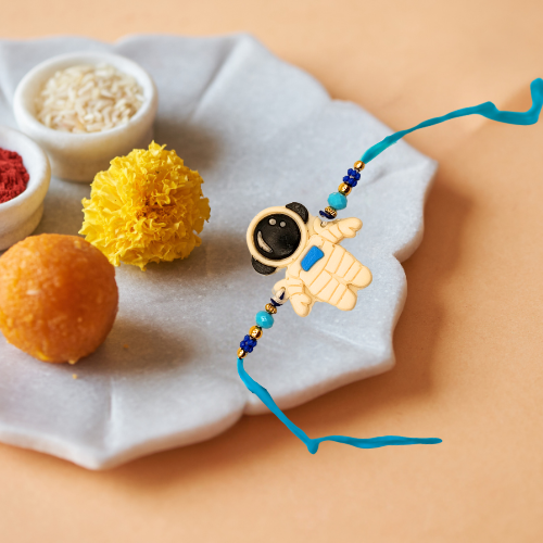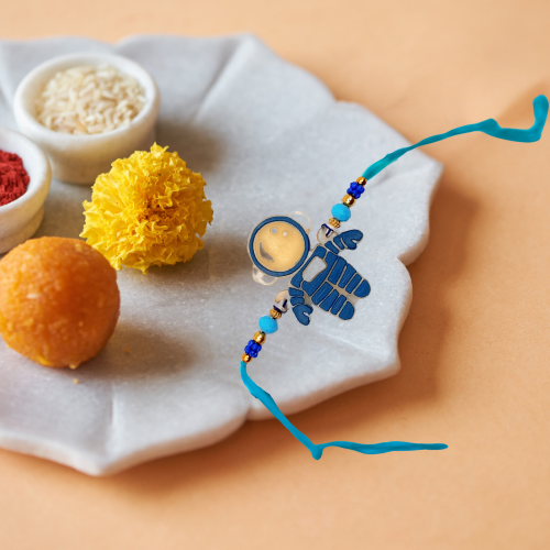 Vystřelte své oslavy Raksha Bandhan do stratosféry s naším astronautem Rakhim! Toto dobrodružné rakhi ( náramek) se vyznačuje detailní ozdobou astronauta, který je kompletní ve skafandru, připraven prozkoumávat vesmír. Spolu s galaxií modrých a zlatých korálků podél odolné bílé a modré šňůry zachycuje ducha objevování a snů. Tato rakhi je ideální pro začínající astronauty nebo vesmírné nadšence ve vaší rodině a je zábavným a inspirativním způsobem, jak oslavit neomezené pouto mezi sourozenci.